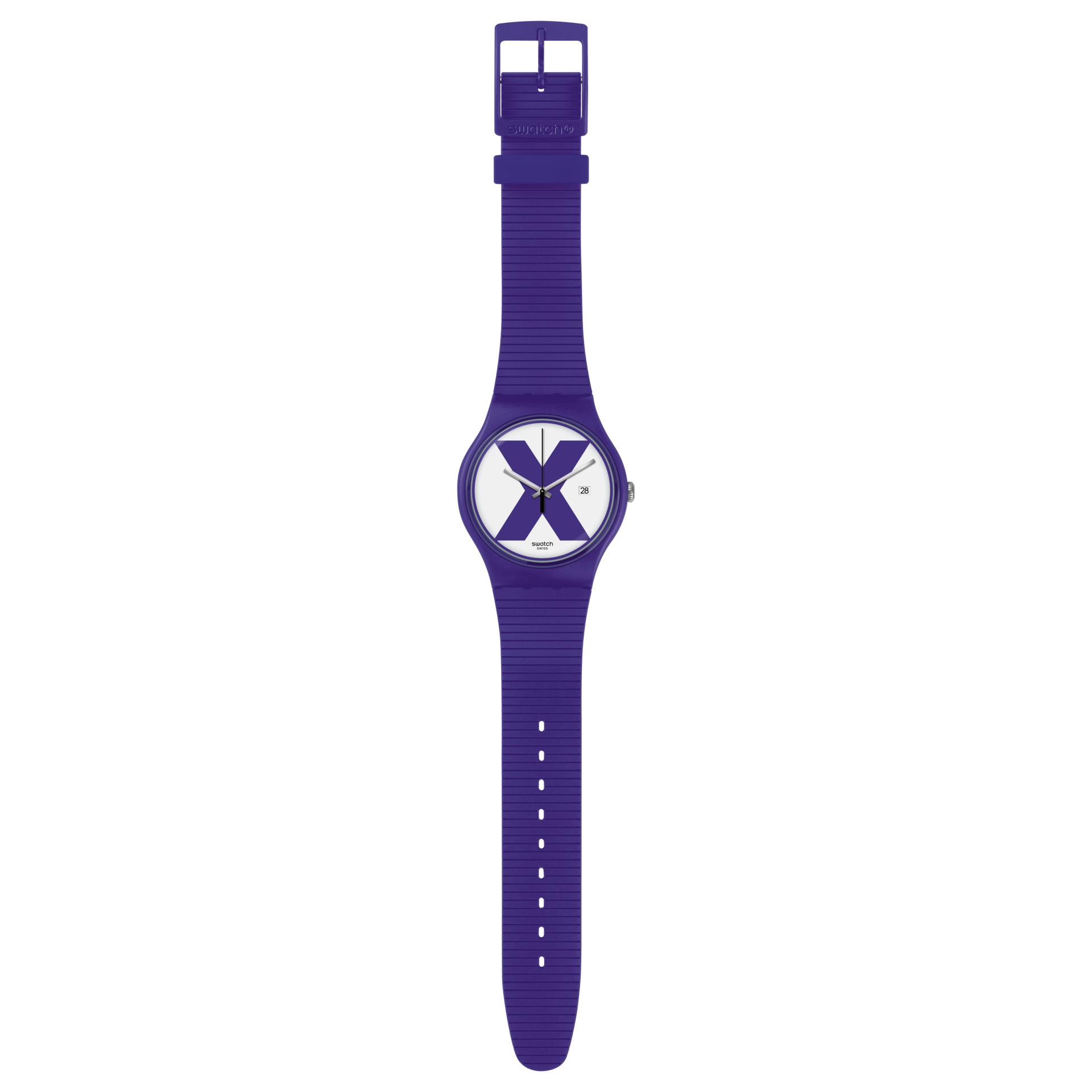 X marks the spot! XX-RATED PURPLE looks cosmic and cool with a violet X on a white dial and a violet ribbed silicone strap.